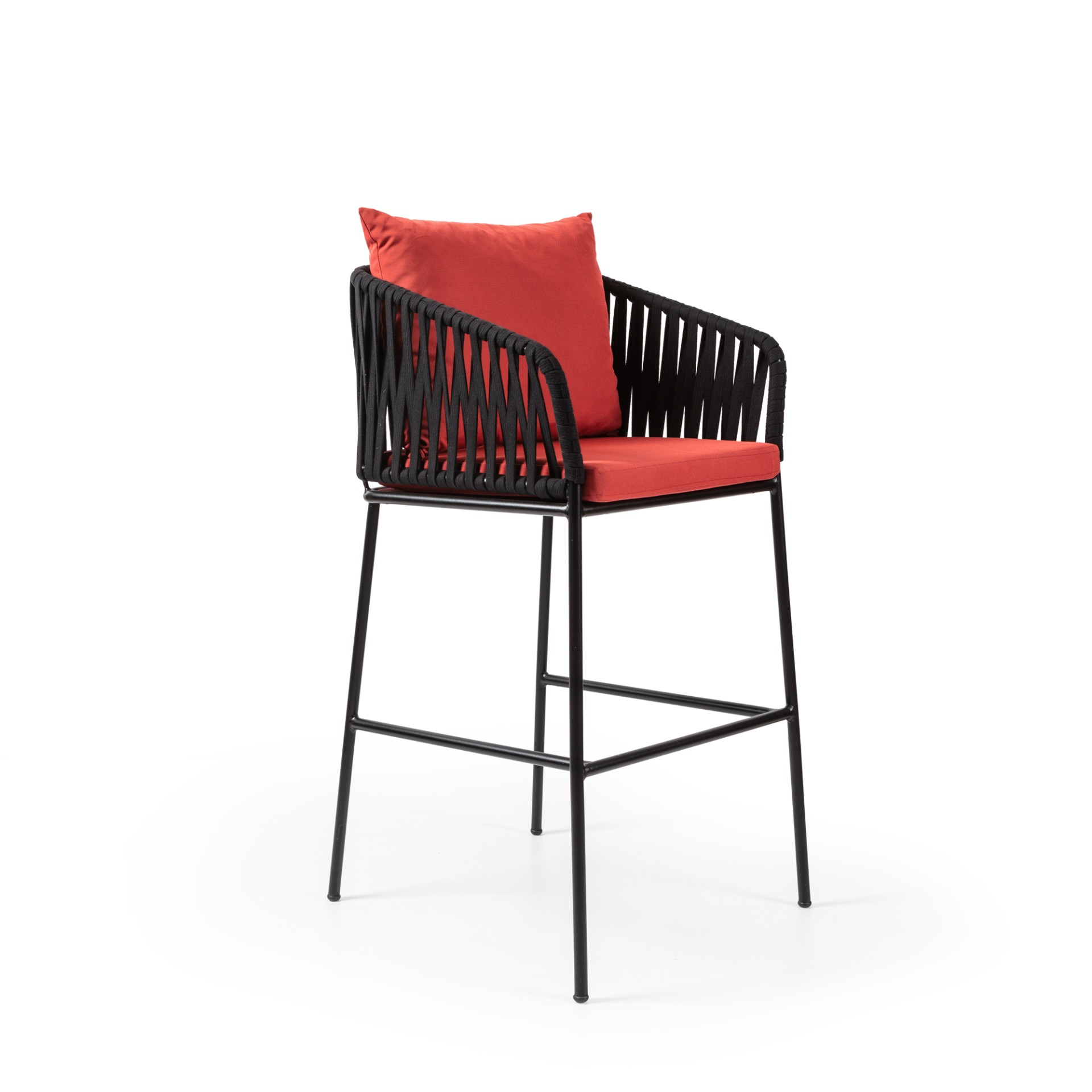 Trap Dış Mekan Bar Sandalyesi, dış mekân kullanımı için özel olarak geliştirilen modern örgü detayları, dayanıklı metal ayakları ve konforlu oturum yapısıyla estetik ve işlevselliği aynı potada buluşturan güçlü bir dış mekân bar sandalyesidir.